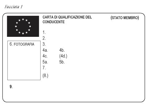 9. categorie di veicoli per le quali il conducente risponde agli obblighi di qualificazione iniziale e di formazione periodica;e) la dicitura «modello delle Comunità europee» nella lingua o nelle lingue dello Stato membro che rilascia la carta e la dicitura «carta di qualificazione del conducente» nelle altre lingue della Comunità, stampate in blu in modo da costituire lo sfondo della carta:
